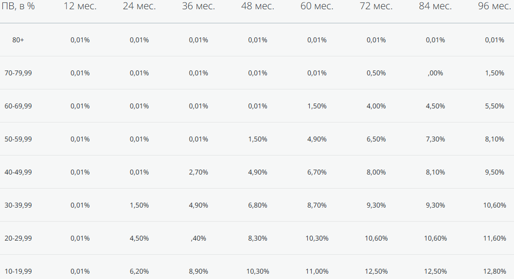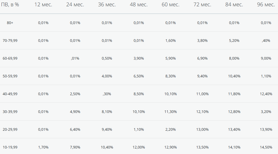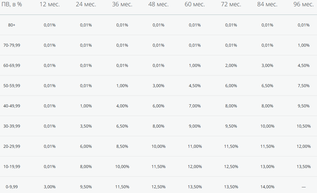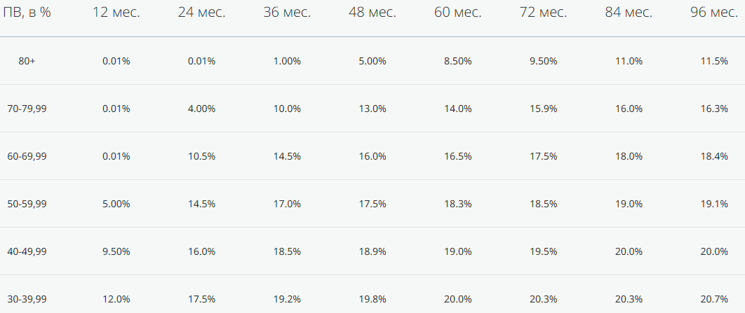 Диапазон Полной стоимости кредита в % годовых составляет от 0,005% до 13,245%. % ставка составляет от 0,010% до 12,800%, на диапазонах первоначального взноса от 10,000% до 90,000% включительно от стоимости автомобиля, при сроке кредита от 12 до 96 мес. и определяется индивидуально. Оценивайте свои финансовые возможности и риски.