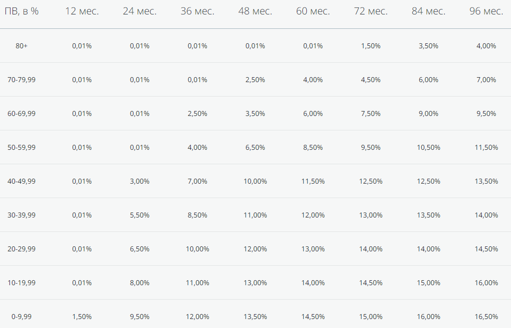 - При сроке 36 месяцев: ставка 0,01% годовых при первоначальном взносе от 70%.