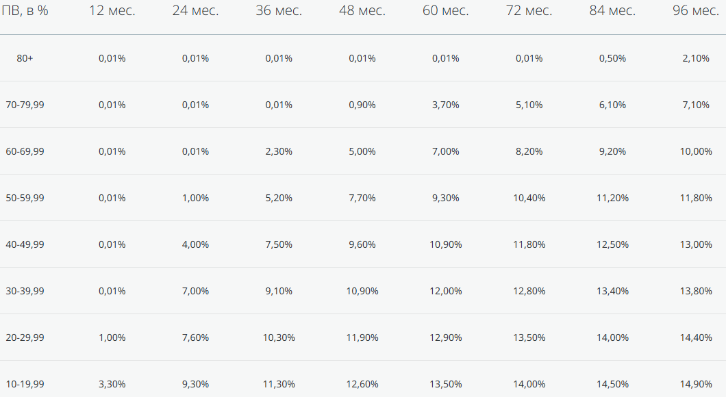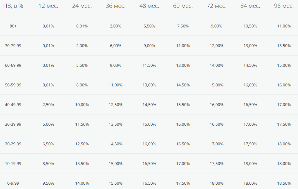 Диапазон Полной стоимости кредита в % годовых составляет от 0,005% до 17,098%. % ставка составляет от 0,010% до 16,600%, на диапазонах первоначального взноса от 10,000% до 90,000% включительно от стоимости автомобиля, при сроке кредита от 12 до 96 мес. и определяется индивидуально. Оценивайте свои финансовые возможности и риски.
